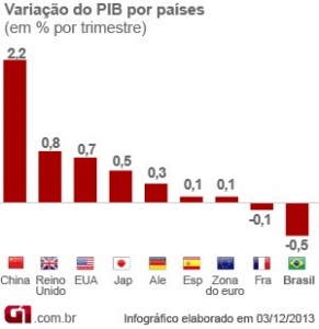 Na comparação com o mesmo período de 2012, o PIB do terceiro trimestre de 2013 aumentou 2,2%, abaixo dos 2,5% previstos pelo ministro Guido Mantega na véspera.