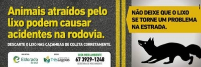 A Eldorado Brasil, maior e mais moderna indústria de celulose do mundo, em parceria com a Secretaria Municipal do Meio Ambiente de Três Lagoas (MS), promove a campanha de educaçãoambiental para conscientizar rancheiros e motoristas sobre a importância do descarte correto de resíduos nas rodovias. A ação, que terá outdoors espalhados ao longo da rodovia BR 158, entre os quilômetros 269 e 231, também contará com a intensificação da coleta.