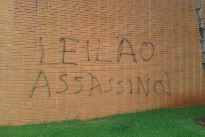 Além da pichação com os dizeres: “leilão assassino”, a vidraça lateral do prédio foi apedrejada, atingindo uma das salas da Federação.