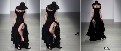 A primeira, que usava um longo branco, deixou o sapato na passarela, quando a seguinte, de preto, entrou e aconteceu o mesmo.