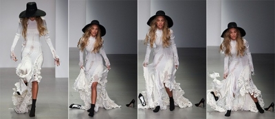 Modelo se enrola com vestido no desfile da grife Sister by Sibling, na semana de moda de Londres, e abandona os sapatos na passarela (Imagem: AFP)