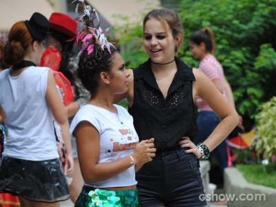 Enquanto estão todos curtindo o Bloco do Embaixada, Julia (Ana Beatriz Cisneiros) nota um gatinho de olho na amiga e dá a maior corda. Antes mesmo de Anita (Bianca Salgueiro) responder qualquer coisa, o moleque já chega: “Será que te convenço a dançar comigo?”. Ela se faz de difícil, mas logo percebe Antônio (Gabriel Leone) vindo em sua direção. Aproveita para aceitar o convite do gatinho e some dali.