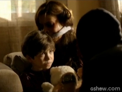 Com a cara limpa, o bandido deixa a casa com Bola, o ursinho de pelúcia do garoto, nos braços. Sem escrúpulos!