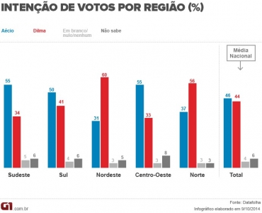 Aécio lidera as intenções de voto no Sudeste, Sul e Centro-Oeste do país, enquanto Dilma está na frente no Nordeste e Norte.