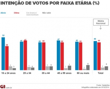 Entre os eleitores jovens, de 16 a 24 anos, Aécio tem 52% das intenções de voto, contra 38% de Dilma. A faixa com eleitores de idade entre 25 a 34 anos é a única em que Dilma aparece numericamente à frente.