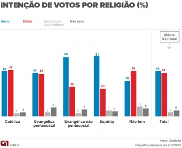 Entre católicos e evangélicos pentecostais, Dilma e Aécio têm desempenho semelhante. Entre evangélicos não-pentecostais e espíritas, Aécio está na frente. Dilma lidera entre os sem religião.