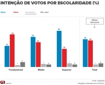 Segundo o Datafolha, Aécio tem a maioria dos eleitores com ensino médio e superior, enquanto Dilma lidera entre os com apenas o ensino fundamental completo.