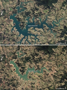 A Nasa divulgou imagens que deixam claros os efeitos na seca na represa Jaguari, no Sistema Cantareira, em São Paulo. As fotos, feitas pelo satélite Landsat 8, em 16 de agosto de 2013 e em 3 de agosto deste ano mostram claramente a diferença no volume da água e também em sua coloração.