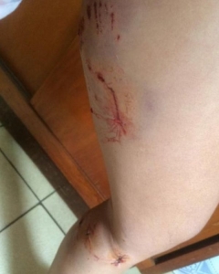 Denise teve uma lesão na perna esquerda, levou 4 pontos e está se recuperando e o cachorro passa bem.