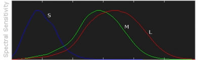 A sua retina é composta por bastonetes e cones. Os bastonetes são mais sensíveis à luz, mas não reconhecem cores, apenas formas. Os cones são sensíveis à cor, porém menos sensíveis à luz – ou seja, em um ambiente escuro, sua visão dependerá mais dos bastonetes que dos cones. Existem três tamanhos de cones: azul (o menor), verde e o vermelho (o maior), como indica o gráfico abaixo: