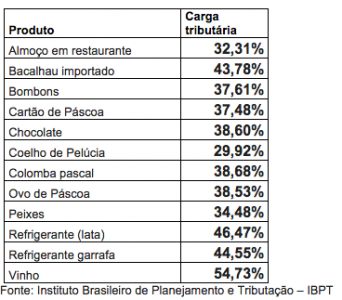 Entre os produtos típicos desta data, o vinho, por exemplo, possui uma das maiores cargas tributárias, que equivale a 54,73% do preço do produto, seguido pelo bacalhau importado, com 43,78% e ovo de chocolate, com 38,68%.