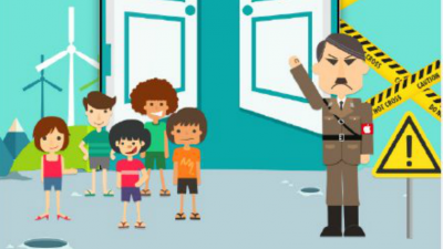 A marca mostra que os clientes podem escolher entre o caminho da esquerda - cheio de crianças - ou o caminho da direita - com esse Hitler fã do iPhone.