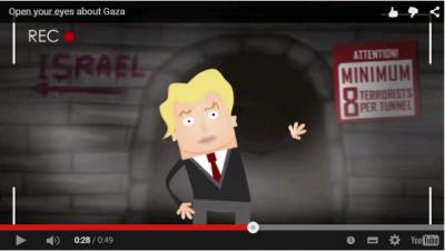 O vídeo termina com uma mulher que entrega ao jornalista um par de óculos e um cartaz que diz: "Abram os olhos. O terrorismo está no poder em Gaza".