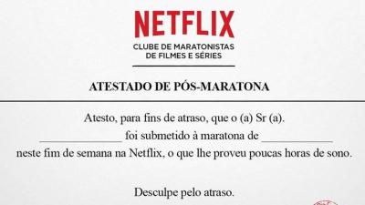 O serviço criou um atestado pós-maratona com o selo Netflix. A brincadeira atesta o atraso da pessoa ao seu compromisso, como trabalho ou estudos, com a justificativa de que ela foi submetida a uma maratona de série, o que lhe ocasionou poucas horas de sono.