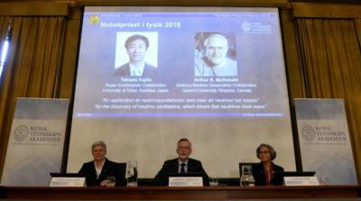 O Nobel de Física de 2015 premiou nesta terça-feira (6) dois pesquisadores que descobriram que os neutrinos, partículas elementares da matéria, têm oscilações, o que demonstra que eles têm massa. O japonês Takaaki Kajita, pesquisador da Universidade de Tóquio, e o canadense Arthur B. McDonald, cientista da Universidade Queen's, receberam o reconhecimento por suas contribuições para o conhecimento sobre a maneira como a matéria se comporta, "descoberta que pode se provar crucial para nossa visão do universo", informou a Academia Real Sueca de Ciências em nota, ao anunciar os vencedores do prêmio de 8 milhões de coroas suecas (equivalente a 962.000 dólares).
