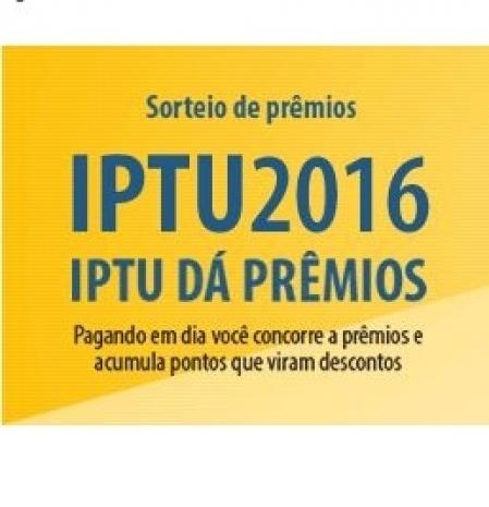 O IPTU/2016, com desconto vence na sexta-feira (11) de Março /2016. O contribuinte que pagar em dia, terá desconto de 5%. Todos os contribuintes que quitarem seus débitos na dada do vencimento poderão participar do programa “IPTU dá Prêmios.