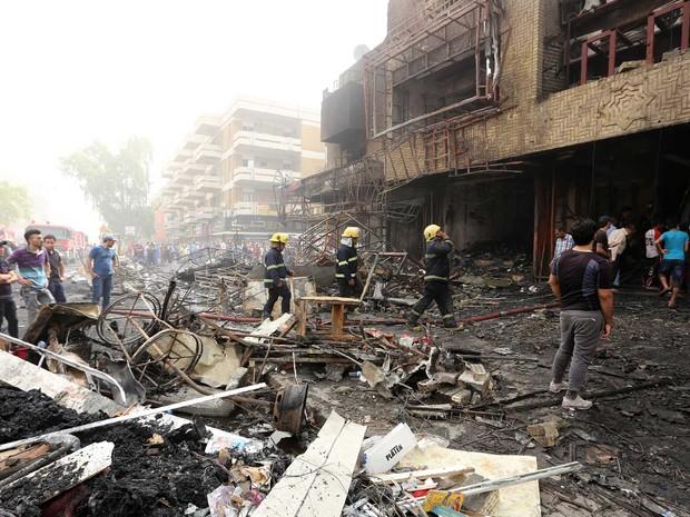 Foto: Bombeiros e iraquianos observam destruição deixada após explosão de carro-bomba no centro de Bagdá (Sabah Arar / AFP Photo)