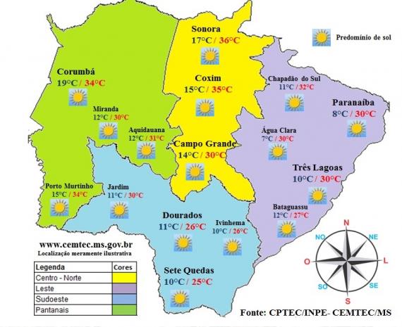 Temperaturas médias máximas previstas por região: 33°C (região norte), 30°C (região leste), 26°C (região sudoeste), 32°C (região pantaneira). Na capital: 30°C.