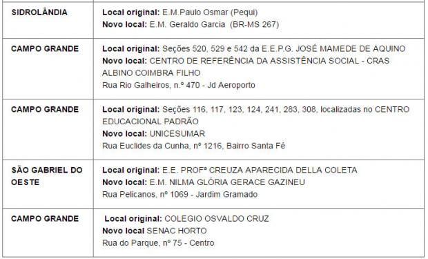 O Tribunal Regional Eleitoral (TRE) divulgou lista de locais de votações que mudaram em oito cidades do Mato Grosso do Sul. Além de Campo Grande, mudanças ocorreram em Bataguassu, Maracaju, Ponta Porã, Bonito, Jardim, Sidrolândia e São Gabriel do Oeste.
