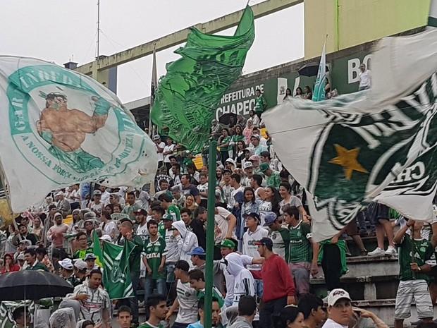 Antes da abertura, eles faziam fila para entrar no estádio e cantavam do lado de fora. Alguns levaram flores. Faixas de campeão da Copa Sul-Americana 2016 eram vendidas nas proximidades. O avião que caiu levava os jogadores para a Colômbia para disputar a final do campeonato.
