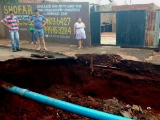 O perigo foi sinalizado com cones, mas os vizinhos têm medo de que possam acontecer acidentes, como queda de animais e crianças. No buraco, há vazamento de água.