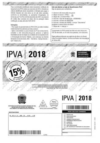 Comprovante do contribuinte: Canhoto onde serão autenticados os pagamentos efetuados pelo contribuinte, de acordo com a modalidade de pagamento escolhida. É o comprovante que o contribuinte tem de que suas obrigações foram quitadas. O canhoto é composto dos campos exercício do imposto (2018), nome do proprietário do veículo e dados do veículo (placa, número do Renavam, marca e modelo, ano de fabricação, cor predominante, município de registro, número do chassi) – primeira janela do canhoto.