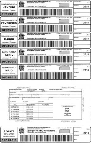 Cota única: Destinado ao pagamento do imposto em valor único, com desconto de 15% sobre o valor, com pagamento até 31.1.2018. O canhoto é composto dos campos placa do veículo, data de vencimento da cota única, código do tributo que está sendo recolhido (nesse caso, 210), código de barras, data de referência do imposto (2018), número do documento (número interno de referência da Sefaz-MS), valor do imposto já com o desconto de 15%.
