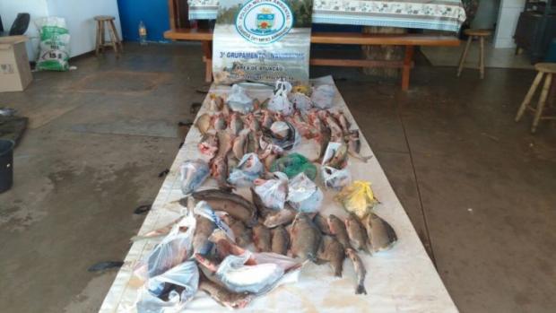 Durante a operação ocorrida nesta quinta-feira, dia 22 de fevereiro, foram apreendidos 118 quilos de pescado, sendo 40 quilos de peixes frescos, ou seja, capturados durante a piracema e vários exemplares abaixo da medida permitida por lei, duas redes de pesca (petrecho proibido), um freezer, 18 quilos de carne de jacaré, além de três rifles calibre 22 e munições.