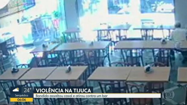 Imagens de câmeras de segurança flagraram momentos de pânico num bar, na Tijuca, na Zona Norte do Rio. Testemunhas contaram que dois bandidos de moto assaltavam um casal na Rua Afonso Pena quando uma das vítimas corre em direção ao bar.