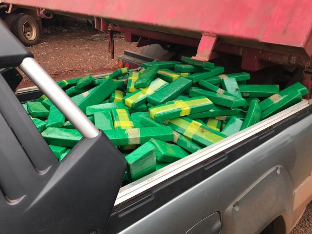 Um casal de cães farejadores, pertecentes ao canil da PF de Dourados, encontrou a droga, escondida no fundo falso da caçamva, sob a carga de grãos.