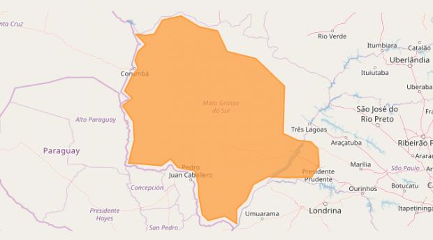 Chuvas torrenciais com ventos intensos que podem chegar a 100 quilômetros por hora devem ser registrados em 71 municípios do Leste, Sul, Sudoeste, Centro e Pantanal sul-mato-grossense. Também há possibilidades de queda de granizo. O alerta se encerra às 23h59 de hoje.