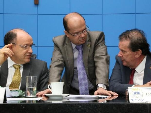 Deputados Junior Mochi (MDB), José Carlos Barbosa (DEM) e Eduardo Rocha (MDB), durante sessão (Foto: Victor Chileno/ALMS)
