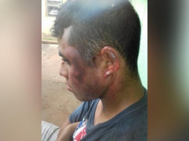 Rosto de Douglas Carneiro Cardoso após as agressões (Foto: Bruna Pasche)