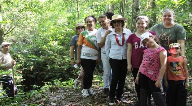 Eram 9 horas quando o grupo partiu do receptivo – uma bela estrutura com dependências administrativas, auditório, alojamentos para até seis pessoas, cozinha industrial, salas de aula e vestiários para os alunos do Projeto Florestinha. Guiados pelo guarda-parque Luís Andino Matas, iniciamos a caminhada pela Trilha do Turista, após rápida parada para fotos na placa que identifica alguns animais já vistos no Parque: tamanduá, anta, tatu, mutum, macaco, veado. A passos lentos, intercalados por explicações do guia, o grupo foi penetrando na mata fechada enquanto sentia a temperatura amenizar.