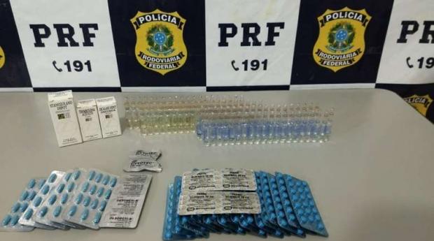 No painel do veículo estavam escondidos, 200 comprimidos de Pramil Sidenafil, 90 comprimidos de Desobesi-M, 40 ampolas de Durateston, 40 ampolas de Deca Durabolin, um frasco de Trembolona Acetato, um frasco de Stanozoland Depot e um frasco de Decaland Depot.