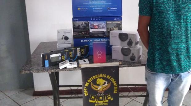 O homem estava em uma moto vermelha de origem paraguaia, sem placa e documentação. Também foi apreendido uma caixa de produtos adquiridos no Paraguai.