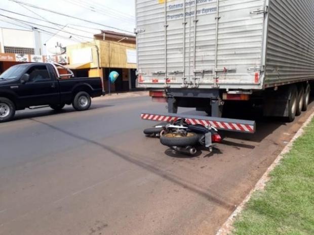 Motocicleta da vítima ficou presa sob o caminhão. - Crédito: (Fernanda Palheta)