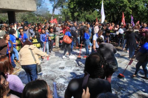 Servidores estaduais fizeram manifestação em frente à Secretaria de Educação, no Parque dos Poderes, em Campo Grande. Em ato simbólico, “limparam” a entrada do prédio. Os funcionários participaram mais cedo de protesto contra a reforma previdenciária e do corte de verbas nas instituições federais.
