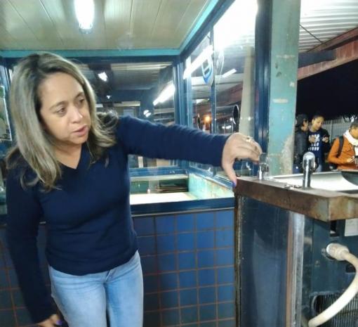 Conforme ainda a vereadora, outra preocupação é com a água consumida pelos usuários do terminal. "Só há um bebedouro aqui e além de estar com as torneiras quebradas, essa água pode trazer risco à saúde. Nós verificamos que a água tem cheiro forte e gosto de ferrugem. E isso pode ser em razão da falta de manutenção da caixa d’água que abastece o transbordo", esclareceu Lia Nogueira.