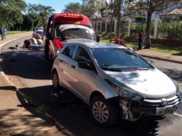 Com o impacto, a parte da frente do carro ficou bastante danificada e a moto destruída. De acordo com o Corpo de Bombeiros, a vítima está com suspeita de fratura na cintura, no fêmur esquerdo e luxação no ombro direito. Ele foi levado para Santa Casa.