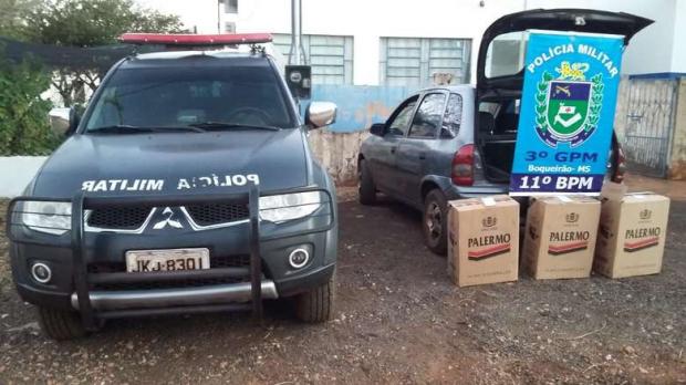 No interior do automóvel havia dois homens, um de 24 e outro de 25 anos. Durante a busca veicular, a guarnição localizou três caixas de cigarros contrabandeadas do Paraguai.