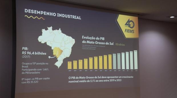 No comparativo de 2009 a 2019, o PIB Industrial saltou de R$ 6,21 bilhões para R$ 21,7 bilhões (249,44%), enquanto de 2018 a 2019 a elevação foi de R$ 20,4 bilhões para R$ 21,7 bilhões (6,37%), de 2019 para 2020 vai sair de R$ 21,7 bilhões para R$ 23,1 bilhões (6,45%) e de 2019 a 2023 sairá de R$ 21,7 bilhões para R$ 27,8 bilhões (28,10%). “A atividade industrial vem mostrando números satisfatórios que merecem não só serem visualizados, mas também comemorados”, disse o presidente da Fiems.