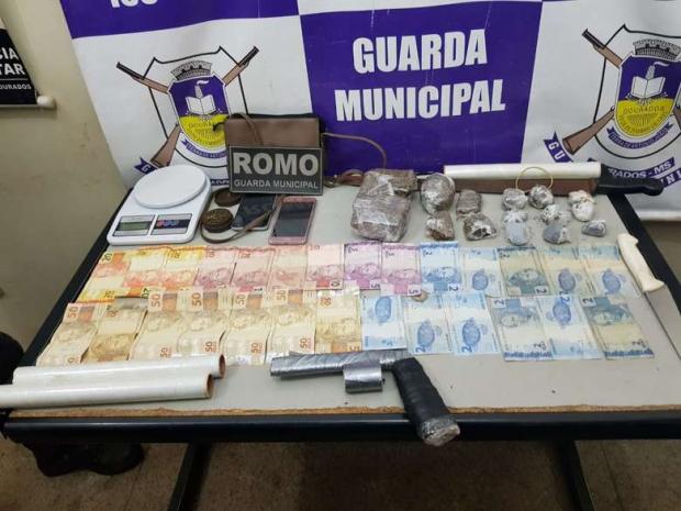 Posteriormente, os guardas se deslocaram até a casa do rapaz, próximo do local da abordagem e lá apreenderam simulacro de arma de fogo, 12 porções de maconha prontas para a venda, outros quatro pedaços totalizando 431 gramas, R$ 483, faca, aparelho de telefone celular e papel filme para embalo da droga.