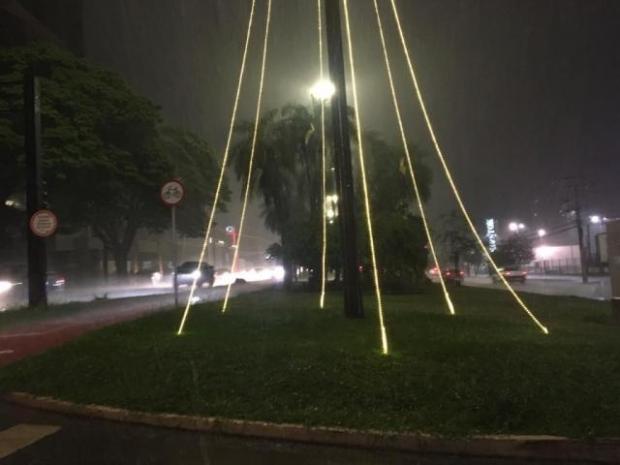 Avenida Afonso Pena, durante forte pancada da chuva no começo desta noite (17). (Foto: Direto das Ruas)