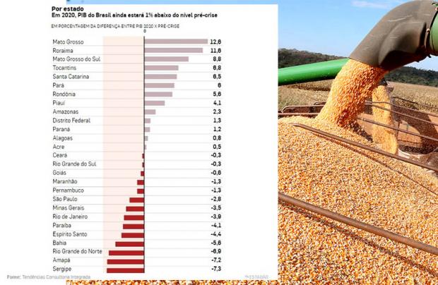 O PIB brasileiro fechará o ano 1% abaixo do nível pré-crise. Os piores resultados são esperados para Bahia (-5,6%), Rio Grande do Norte (-6,9%), Amapá (-7,2%) e Sergipe (-7,3%). O PIB é a soma de todos os bens e serviços produzidos em determinada localidade.