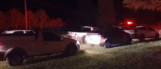 A polícia recebeu a informação de que vários veículos estavam escondidos de forma suspeita no assentamento. Uma equipe se deslocou para averiguação e localizou os oito veículos.