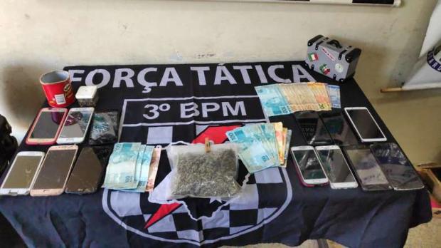 No local havia 120 gramas de maconha em um saco plástico, bitucas de cigarros feitos com a droga, além de 13 aparelhos de telefone celular de várias marcas e modelos e R$ 1,6 mil.