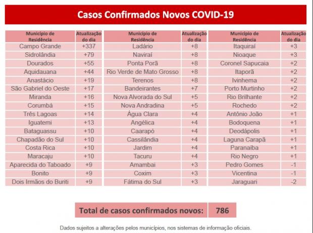 Nas últimas 24 horas a Secretaria de Estado de Saúde (SES) confirmou 16 óbitos, sendo seis em Campo Grande, quatro em Corumbá, e Costa Rica, Anastácio, Aquidauana, Ladário, Dourados e Caarapó confirmaram um óbito cada. Cinco deles com nada relatado, e os demais com fatores de risco e comorbidades.