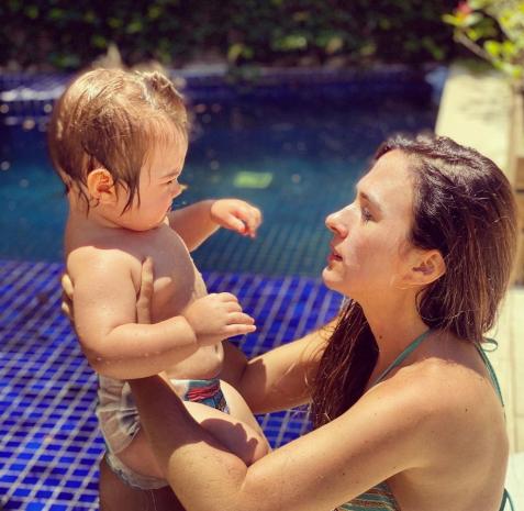 Tatá Werneck brinca com a filha na piscina e faz piada: 'Mães que exageram no protetor solar, me adicionem'
