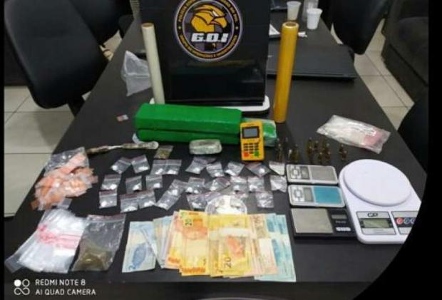 No interior do automóvel foram localizados três tabletes de maconha e certa quantia em dinheiro. O suspeito afirmou que seguia para realizar a entrega do entorpecente. Na residência de onde ele havia saído, os policiais encontraram a esposa do suspeito e uma mala com 56 porções de cocaína, prontas para venda, e quatro balanças de precisão.